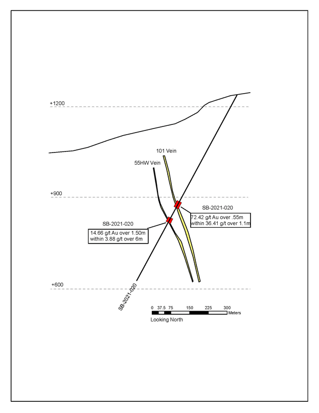 - Hole SB-2021-20 intersected the 101 Vein producing 72.42 g/t gold over 0.55m within 36.41 g/t gold over 1.1m.