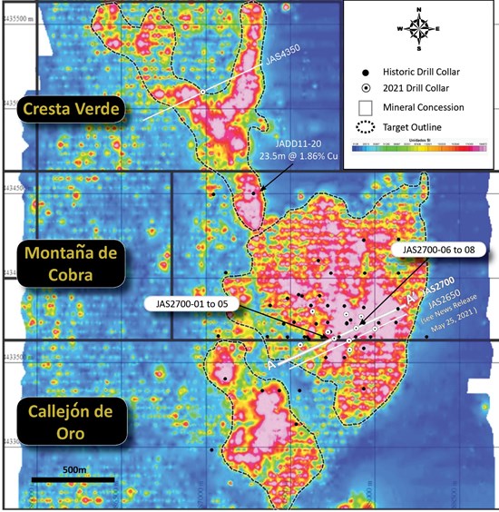Separately, drilling is progressing on a high priority coincident magnetic and IP anomaly at Cresta Verde, 1.8km north-northwest of Line JAS2600 (Figure 1). The current hole (JAS4350-02) has intersected significant intervals of pervasive skarn alteration with semi-massive to massive sulphides and visible copper sulphide mineralization. This hole is collared approximately 700 metres northwest of historic drill hole JADD11-20 that clipped the southeastern edge of the same coincident geophysical anomaly and intersected 23.5m at 1.86% Cu1 from 19m.
