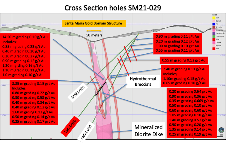 The fence of drill holes SM20-28, 29 and 30 are located 75 meters to the west of drill collars SM20-25, 26, 27, last reported, and were designed to once again tighten up the interpretation of the boundaries of the new Santa Maria gold domain structure with respect the highly auriferous sheeted vein intersected to the east in the previous fence of hole.