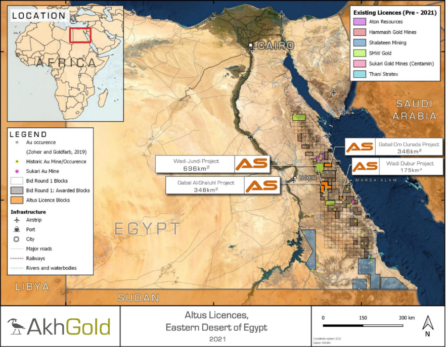 The Licences were awarded to Akh Gold, as part of Egypt’s inaugural and competitive international exploration licence bid round initiated by EMRA in 2020. All four projects, which comprise nine licence blocks, covering 1,565 km2, are situated in eastern Egypt, between 30 km and 100 km of the Red Sea coast. The Licences have been awarded for an initial two-year term, with each Licence renewable for up to two further periods, each of two years duration.
