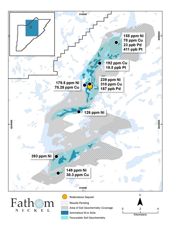 Ian Fraser, Fathom’s VP Exploration stated, “The distribution of highly anomalous Ni values and the associated elements over such a large area and the confinement of these highly anomalous zones within what appear to be well-defined lineaments, is very encouraging and suggestive of other magmatic nickel sources occurring at the Albert Lake Project. Management is confident that integrating the soil geochemistry with all other data sets the Company has created will be very instrumental in the drill targeting process as we seek to discover other nickel deposits similar to the historic Rottenstone Mine elsewhere on the Albert Lake Property. Also of note, the soil geochemistry data base has only covered a portion of the property area. We look forward to the remaining 2021 results and expanding this soil geochemistry database.”