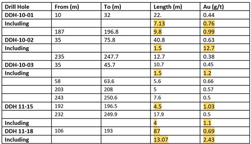 The Easter Egg zone drilling followed up on four historical diamond drill holes done in 2010-2011. A re-assay using metallic screen for coarse gold mineralization showed DDH-11-18 highlighted a potential discovery hole with an intercept of 12.81 g/t over 2.1m first reported February 1, 2021. Follow up drilling from June 2021 has confirmed 2 horizons of gold mineralization at the Easter Egg target while remaining open in all directions and at depth.