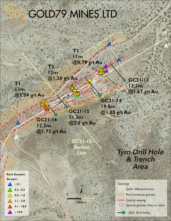 Ottawa, Ontario–(Newsfile Corp. – October 25, 2021) – Gold79 Mines Ltd. (TSXV: AUU) (OTCQB: AUSVF) (“Gold79” or the “Company”) is pleased to announce preliminary results for the first four drill holes (223 meters) from its recently completed 16 hole program at the Gold Chain project in western Arizona. The four holes highlighted in this release were drilled across the northernmost exposures of the Tyro target and tested broadly mineralized surface exposures at depths from 20 to 40 meters below the surface. Results from the remaining 12 holes (852m) are pending.