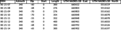 Holes BE-21-12, BE-21-13 and BE-21-14 intersected a large felsic volcanic unit located between 100 and 175 metres northeast and along strike from the East Lens eastern limit at a vertical depth between 150 to 250 metres.