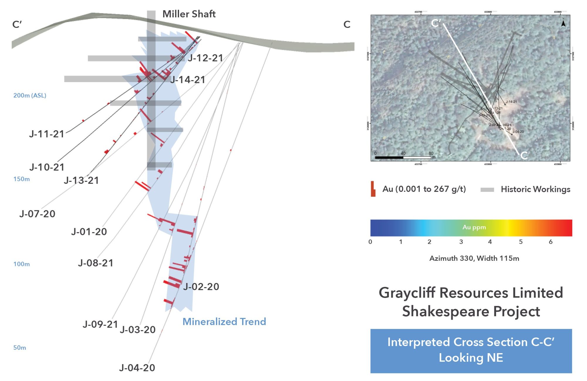 President and CEO, James Macintosh stated: “The continued success we are having at Shakespeare is very encouraging. We now have anomalous gold intervals in 9 out 14 holes and we are getting some very significant widths and grades in several of those holes. As we have mentioned before, we continue to see visible gold in some of the drill core and we look forward to receiving those results in the coming weeks. All of this information will be going into the 3D model that we have commissioned. I strongly believe that at current prices, Graycliff is fundamentally undervalued considering the continuing success of our ongoing drill program”