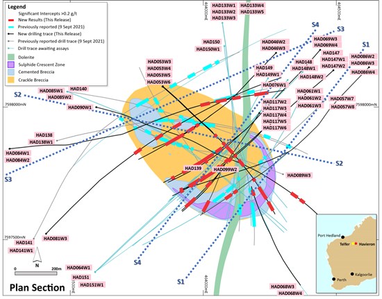 - South East Crescent Zone Growth – assay results reported for three drill holes, and partial results for one drill hole (HAD086W3), with five holes awaiting assays.