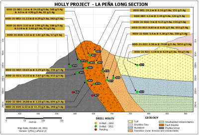 The initial focus at the Peña vein system was to define the vein within the broad zone of the Jocotan fault breccia, extending the mineralization down dip to the zone with consistent high grades that were intersected in holes HDD-21-017 and 019. HDD-21-021 and HDD-21-023 were drilled to cut the Peña vein to the south of the Jocotan fault zone. HDD-21-021 cut minor upper-level veining with weaker mineralization including 1.18m of 0.19 g/t Au and 40 g/t Ag from 53.37 to 54.55m within felsic tuffs. Roughly 80m down dip, HDD-21-023 cut the structure hosted in laminated mudstones where the vein returned 4.58m @ 79.84 g/t Au and 5,053 g/t Ag. This hole confirms the strike extent of the Peña vein to the south and demonstrates that the inter-bedded volcanics and sediments are potentially good hosts for high grade gold and silver mineralization at Holly.