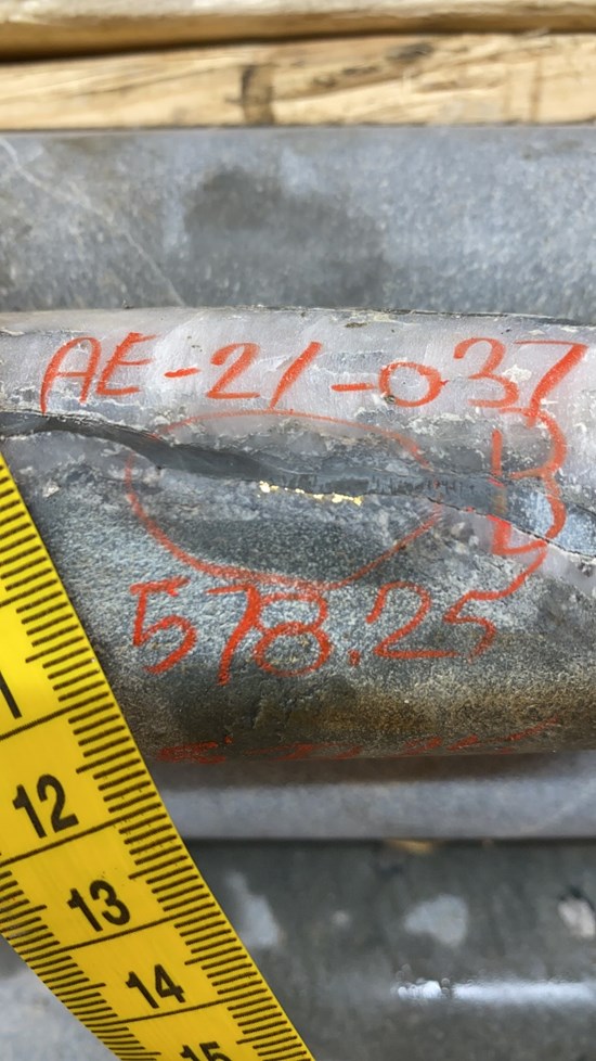 Figure 1: Core photo showing visible gold along the quartz/argillite contact in hole AE-21-037 at a depth of 578.25m – 0.6m sample graded 21.8 g/t gold