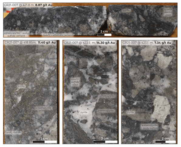- Vein-style mineralization yielding 14.80 g/t Au over 1 m within 2.16 g/t Au over 8 m, also in GR21-007; and 5.30 g/t Au over 1 m in GR21-002