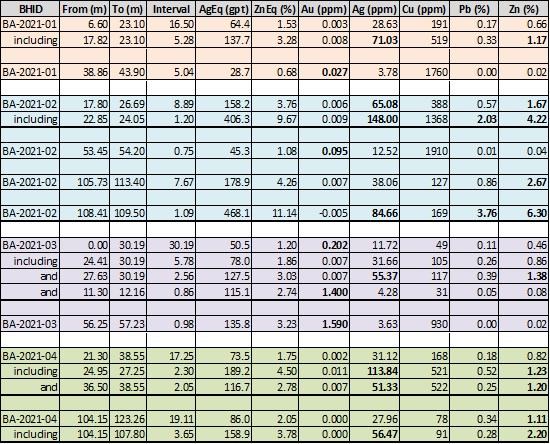 The holes encountered variable grades of silver, lead, zinc, copper and gold. Silver-equivalents and zinc-equivalents have been calculated (AgEq and ZnEq). Table 1 below includes the highlights.
