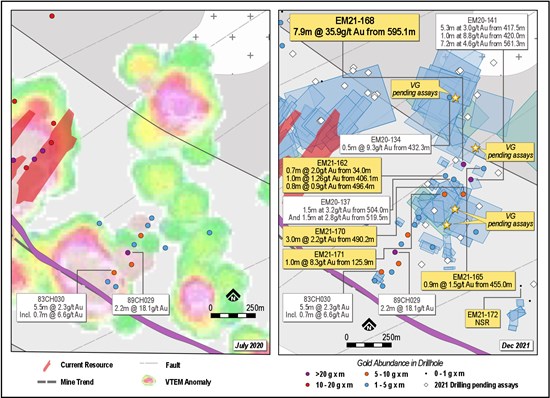 7.9m at 35.9g/t gold including 1.0m at 268.8g/t gold (EM21-168)