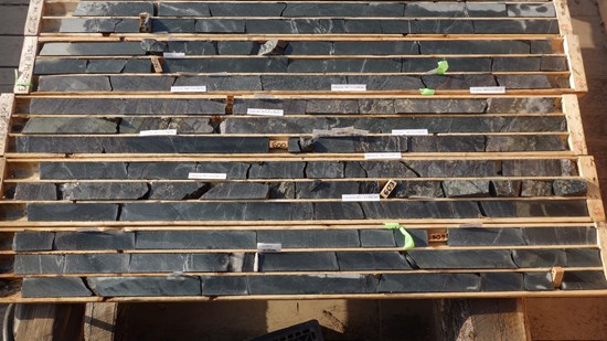 Drillhole EM21-229, which is the easternmost hole drilled to date at Eastmain, returned strongly mineralised core with visible gold mineralisation present at the shallow depth of 81.3m (see figure 8) associated with a strongly deformed and altered horizon within the volcanic sequence.