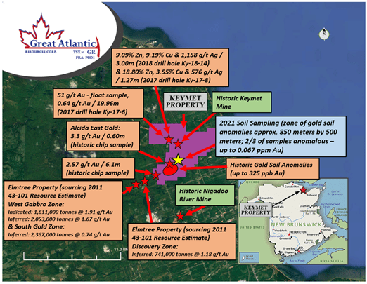 VANCOUVER, BC / ACCESSWIRE / December 10, 2021 / GREAT ATLANTIC ESOURCES CORP. (TSXV:GR) (the “Company” or “Great Atlantic”) is pleased to announce that it has identified a new zone of gold soil anomalies at its Keymet Precious Metal – Base Metal Property, located in northeast New Brunswick. The zone covers an area of approximately 850 meters by 500 meters, being open in all directions. Approximately 66% of the 2021 soil samples within the zone returned anomalous gold values of 0.005 – 0.067 parts per million (ppm).