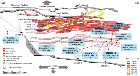 - Exploration holes at Drill Station 2 (Figure 2) have yielded strong results below the existing workings in the NE section, including new results reported at 3.18% Cu over 3.67 m, 2.85% Cu over 3.97 m and 3.24% Cu over 2.68 m (Figure 1). Previous reported results from this area include 2.97% Cu over 4.86 m (full assay results are listed in Figure 3).