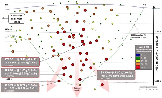 Figure 1: Plan map at the Cliff Creek Deposit highlighting new 2021 drill results.