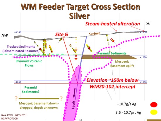 Vancouver, British Columbia–(Newsfile Corp. – January 10, 2022) – Bravada Gold Corporation (TSXV: BVA) (FSE: BRTN) (OTCQB: BGAVF) (the “Company” or “Bravada”) has received approval for an amendment to its drilling permit, which was submitted in late September 2021. The extensive delay is believed to be related to COVID-19 staffing issues. After posting a small increase in bond, five new drill sites will allow deeper tests of the vein system that was discovered in Q4 2020 by drilling beneath mine waste and other overburden at the Feeder Target, in which hole WM20-102 intersected 1.5 metres of 269.0g/t Ag and 0.404g/t Au within a thicker interval of banded quartz veining together with anomalous gold and silver. Four reverse-circulation holes drilled in 2021 to further test this target extended the strike length of banded quartz veining to +300m beneath overburden but failed to test the vein system deeper than the WM20-102 high-grade silver intercept due to unexpected shallowing of 2021 drill holes. The new sites (see Figure 1) will allow a better drill orientation designed to intersect the vein zone at a deeper elevation (see Figure 2).