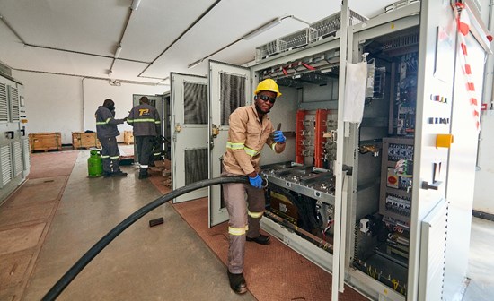 Electrician Tresor Nawej Tshimwish installing an electrical cable at the Phase 2 high-pressure-grinding-rolls (HPGR) substation. More than 83% of the Phase 2 electrical cable has been installed.