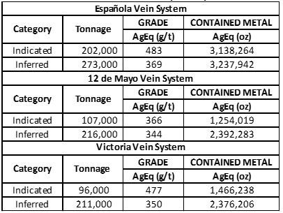 - The resource model extends to a maximum depth of 230 m from surface in the 12 de Mayo vein, 200 m in the Española vein and 180 m in the Victoria vein. All three vein systems appear to be similarly important in controlling silver mineralization and remain open along strike and at depth.