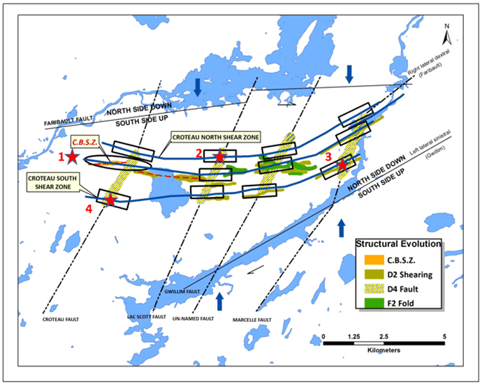 Figure 4. Croteau Est Target Areas. The CBSZ 43-101 compliant resource occurs at the intersection of the east to west oriented Croteau Bouchard Shear Zone and the northeast to southwest oriented Croteau Fault. There are at least 11 other such opportunities that occur on the Croteau Est property where east-west oriented shear zones are cross-cut by northeast to southwest faults. Gold showings at several of these intersections including Trench 101, Area # 5 and Croteau South emphasize this opportunity.