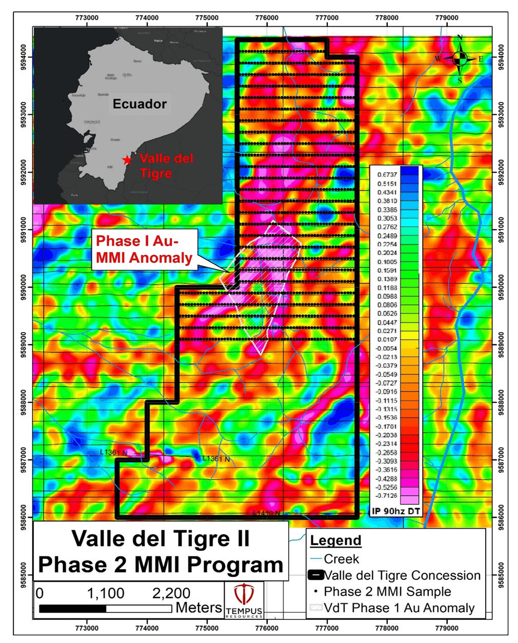 Phase 2 exploration will include a Mobile Metals Ion (MMI) geochemistry sampling program over an area of focus of approximately 12.5 square kilometres, where approximately 1,100 MMI samples will be taken. Sample spacing is planned at 200 m x 50 m. Where possible, stream sediment and grab samples will also be collected. The Phase 2 program will overlap Phase 1 and cover the airborne geophysics chargeability anomaly identified by Tempus in 2019 (see Tempus announcement dated 16 December 2019). Trends identified by the geophysics coincide with known regional structures important to mineralization in the area. The geophysics highlights the NNW-SSE structure bound by NE-SW structures at VdT, which is similar to the controlling structures present at Fruta del Norte.