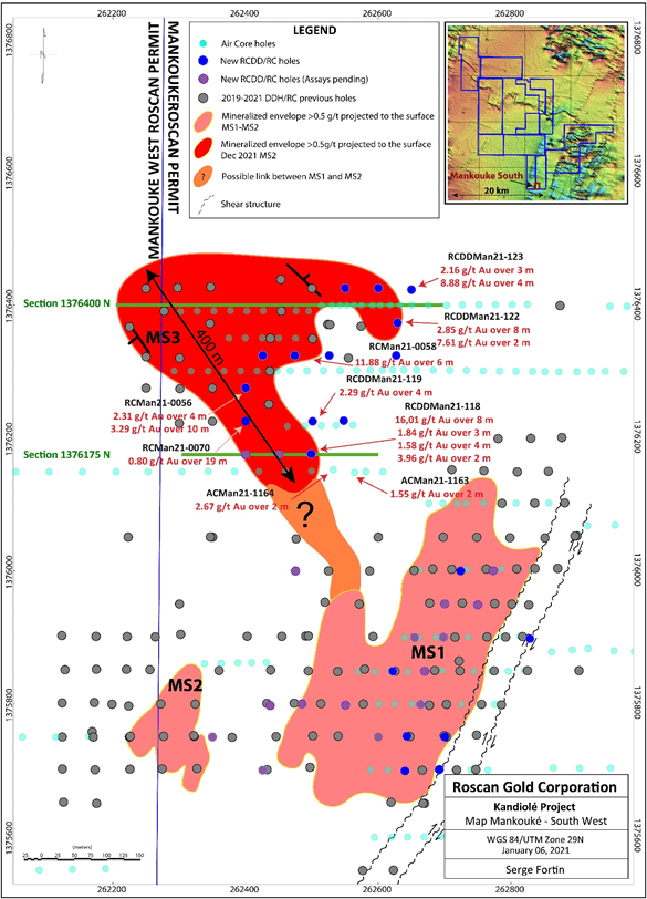 TORONTO, ON / ACCESSWIRE / January 10, 2022 / Roscan Gold Corporation (“Roscan” or the “Company”) (TSX-V:ROS)(FSE:2OJ)(OTCQB:RCGCF) is pleased to announce positive results (Figure 1) from an additional 2 Air Core (AC) and 14 Reverse Circulation (“RC”) and Diamond Drilling (“DD”) holes totaling 2,456 meters (m) at our Southern Mankouke Zone (MS3 targets). MS3 shows potential of a high-grade extension to the East and South, open at depth and to the North and South.
