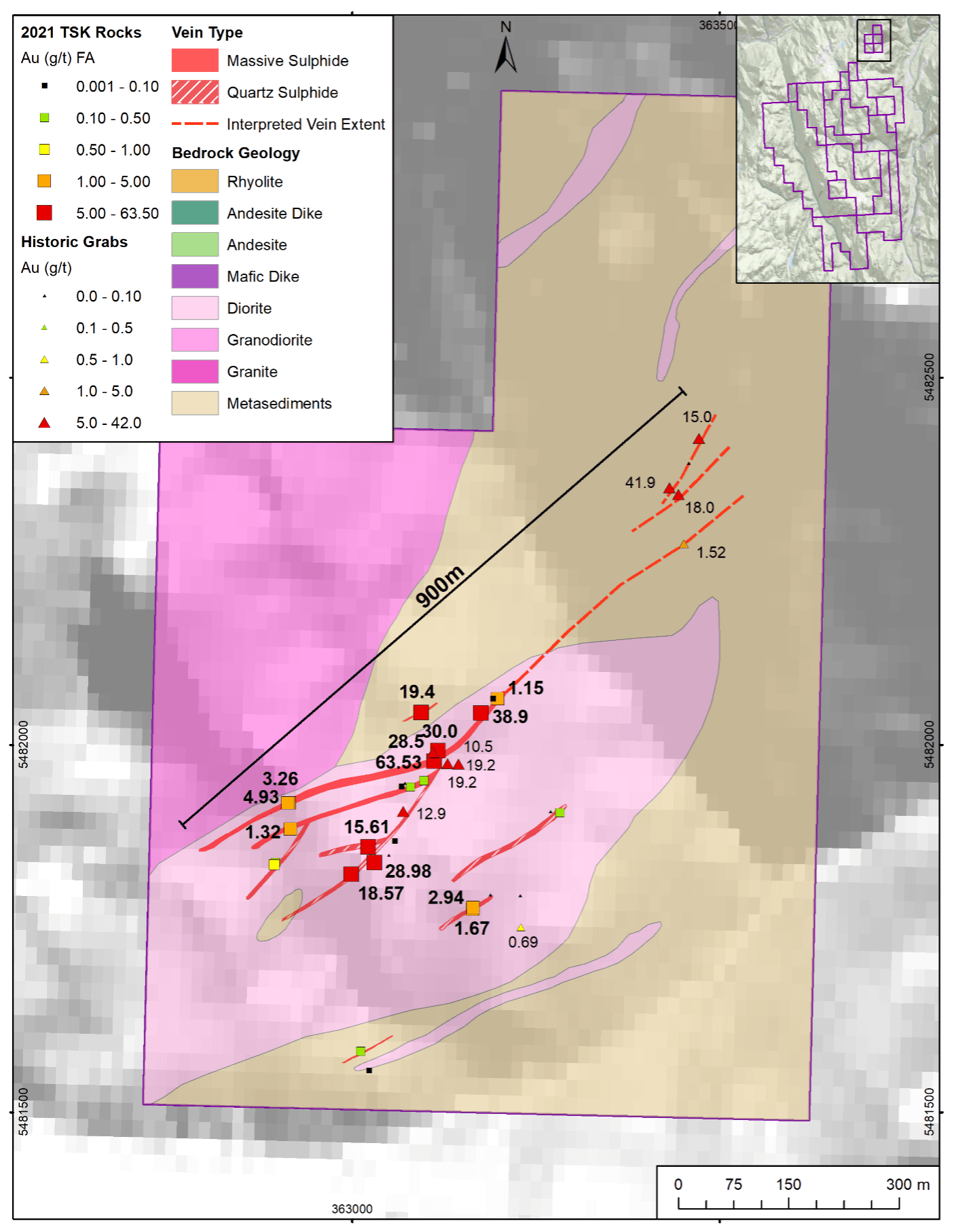 - Mapping identified multiple high grade sheeted veins within a 300 to 500 metre zone with historic sampling projecting potential strike length of veining to one kilometre.