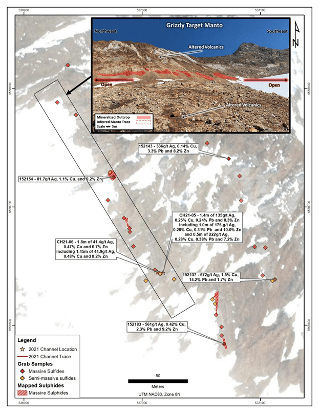 The Grizzly and Sulphide City Targets were discovered by the Core Assets Team in 2021. The Grizzly Target consists of two sub-parallel Ag-Zn-Cu-Bi-rich carbonate replacement mantos (i.e., bedded massive sulphide ore bodies) that are observable at surface across an open strike length of greater than 500 metres, and at widths of over 5 metres (Figure 2). CRM occurrences at the Sulphide City Target are characterized by multiple, Zn-Cu-Ag semi-massive to massive sulphide occurrences measuring up to 40 metres along strike and 8 metres wide. These occurrences contain significant amounts of sphalerite, pyrite, pyrrhotite, and chalcopyrite. During 2021 Phase 2 exploration efforts, 80 samples were collected across 10 channels ranging from 1.4 metres to 8.6 metres in length (Figure 3). Of the 80 channel samples collected, 5 samples assayed greater than 50g/t Ag, 47 greater than 0.20% Cu, and 33 channel samples collected assayed greater than 5.0% Zn. The best channel sampled at the Grizzly Target (CH21-05) assayed 135g/t Ag, 0.25% Cu, 0.24% Pb, and 8.34% Zn over its entire length of 1.4 metres and included 0.5m of 222g/t Ag, 0.28% Cu, 0.38% Pb, and 7.2% Zn. CH21-02, located at Sulphide City (Whaleback Area) approximately 430 metres west-southwest of CH21-05, returned 5.3 metres of 14g/t Ag, 0.29% Cu and 10.2% Zn; including 0.5m of 46g/t Ag, 0.49% Cu, and 11.8% Zn over 0.5m. CH21-10, located approximately 200 metres northeast of CH21-02 at the main Sulphide City Target area, also returned values of 85g/t Ag, 0.20% Cu, 3.91% Pb, and 4% Zn over 0.5m.