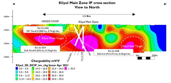 Figure 7: KMZ IP cross-section showing Kliyul East and West Targets