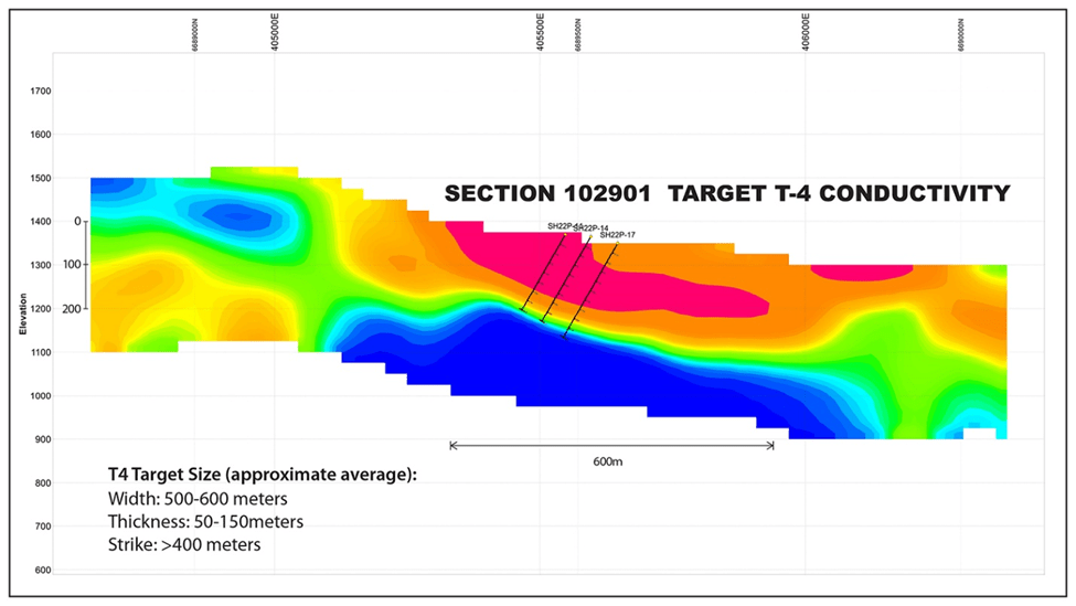 - The conductive zone T-4 has been interpreted to have a more consistent, shallow to moderate dip to the northeast, becoming sub-horizontal below 200 meters depth. It is interpreted to extend to ~600 meters down dip, with a thickness of up to 150 meters and a strike extent over 400 meters. This area is located immediately northeast of the mineralized vein system of the Main Zone and north of an area where mineralized showings have been exposed in trenches.