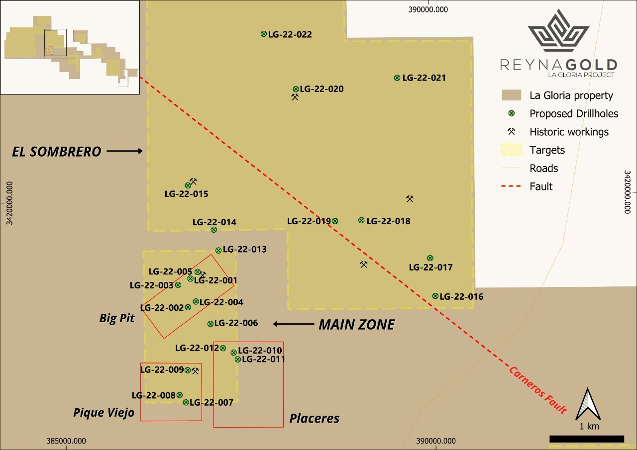 A total of 10,000m of drilling has been approved by the Reyna Board as Phase 1 drilling at La Gloria with the first 22 holes, approximately 3,000m detailed in this press release. Over 20,000m of drill targets have already been identified by the geological team at Main Zone, El Sombrero, Las Quintas, Las Quintas West and San Pedro targets. The intention of Reyna is to confirm additional targets pending ongoing geochemical sampling, geological mapping and initial drill results.