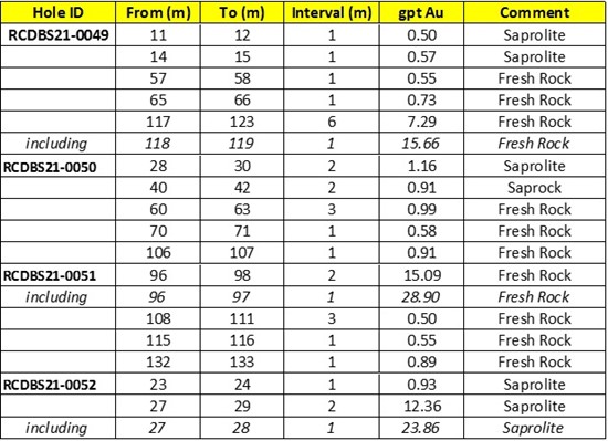 - 7.29 gpt gold over 6m from drill hole RCDBS21-0049 from 117m