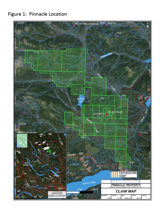 The Pinnacle Project is located within the Quesnel Terrane which is characterized by Late Triassic to Early Jurassic volcanic and sedimentary rocks of island arc affinity that have been intruded by a variety of intrusive phases related to the Late Triassic to Early Jurassic Hogem Intrusive Suite. The property was first explored in the early 1970’s following the identification of anomalous stream sediment samples from reconnaissance prospecting in the central portion of the property at the Aplite Creek Zone where chalcopyrite and secondary malachite occur in a calcite-quartz breccia zone that can be traced for approximately 30 m, and which is approximately 7 m in width. Initial geochemical surveys, limited diamond drilling and geophysical surveys were completed and confirmed the presence of copper and gold mineralization at Aplite Creek. Highlights of the historical work at Aplite Creek include a diamond drillhole drilled by BP Resources in 1990 that reported 6m @ 6.4 gpt gold. Since 2014 the property has seen extensive exploration to the south of the Aplite Creek area including diamond and percussion drilling, induced polarization (“IP”) surveys and airborne magnetic/EM surveys that have identified several broad areas that exhibit widespread porphyry-style alteration in areas of extensive cover. At the Elbow Zone, five of the six diamond drill holes returned anomalous gold, highlighted by 94 metres grading 0.34 g/t gold in DD15ELB001. At the Sooner Zone, diamond drilling in 2015 encountered broad intervals of anomalous low-level copper associated with sericite-biotite alteration.