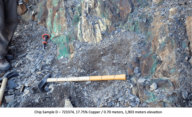 A 2.30-meter section containing 2 meters of vein (samples D-723373-375) and 0.30 meters of footwall sediments averaged 6.43% copper. The 2.0 m section of vein alone without the low-grade footwall sediments contained a copper average of 7.380%. See Table 1 and Photo 3 below.