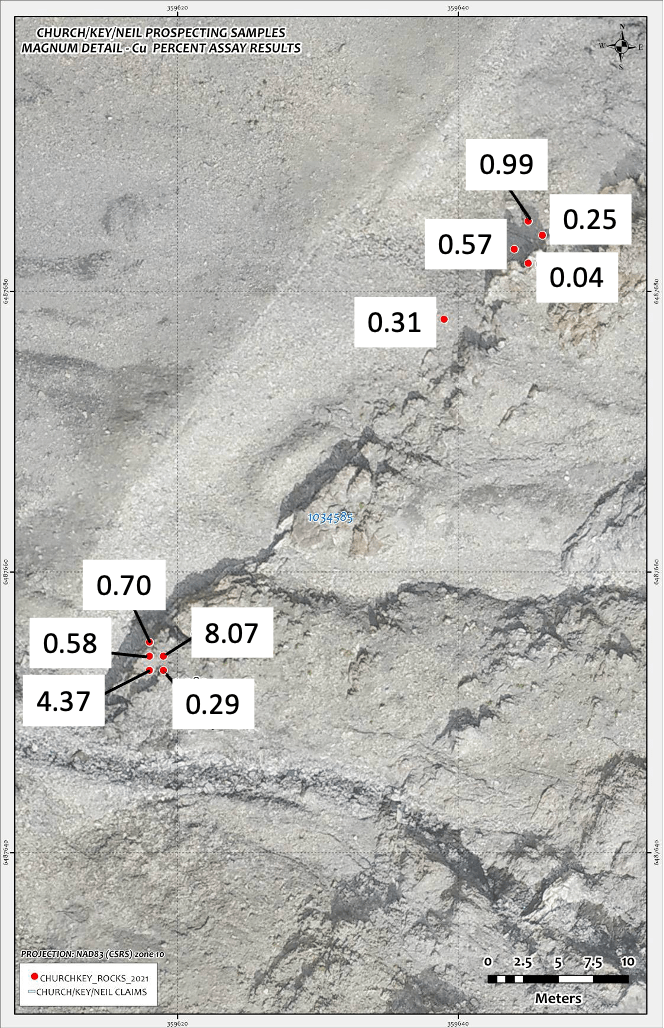 As discussed in the previous release of the UAV Drone work on the Magnum the data generated was used for in-field targeting of visual copper occurrences on the color orthophoto due to the 3 cm resolution which lead to field examination of the mineralized unit to sampling of the Magnum vein where a total of 20 samples were collect as a first pass evaluation. See Figures 9, 10 below.