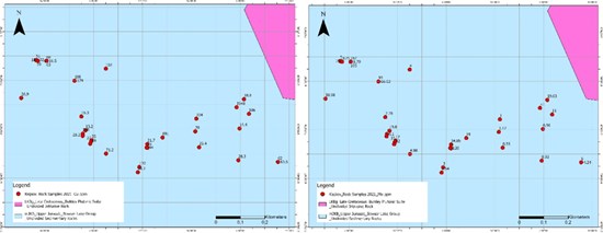 - 31 rock geochemical samples show elevated Cu, Mo, As and Sb anomalies (Table 2, Figure 9) for porphyry signatures.