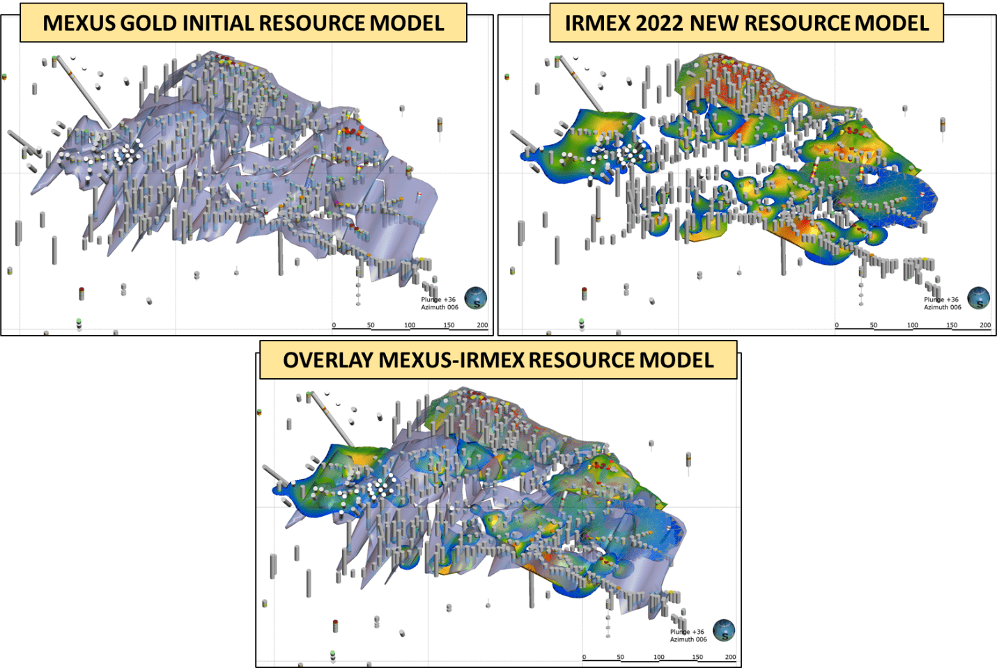 The main focus of the project for Irmex is the outcroping mineralization capping Las Margaritas hill. The ore body is represented in Figure 2 showing a comparison of both the previous model by Pacific Comox and the newest 2022 Irmex model. Previous solid was modelized based primarily on the quartz vein, while Irmex considered only drill hole results at a 0.1 cut-off. It is important to mention that Irmex Mining based its calculation on the actual ore body that will be followed for production which involved significant due diligence on historical data and verification.
