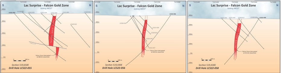 Figure 2. Vertical cross sections illustrating the projected extension of the Falcon Gold Zone to surface, first three drill holes, 2022 winter drill program. Section 1: LCS22-055 (336m); Section 2: LSC22-056 (343m); Section 3: LCS22-058 (340m)(see Figure 1 for collar locations).