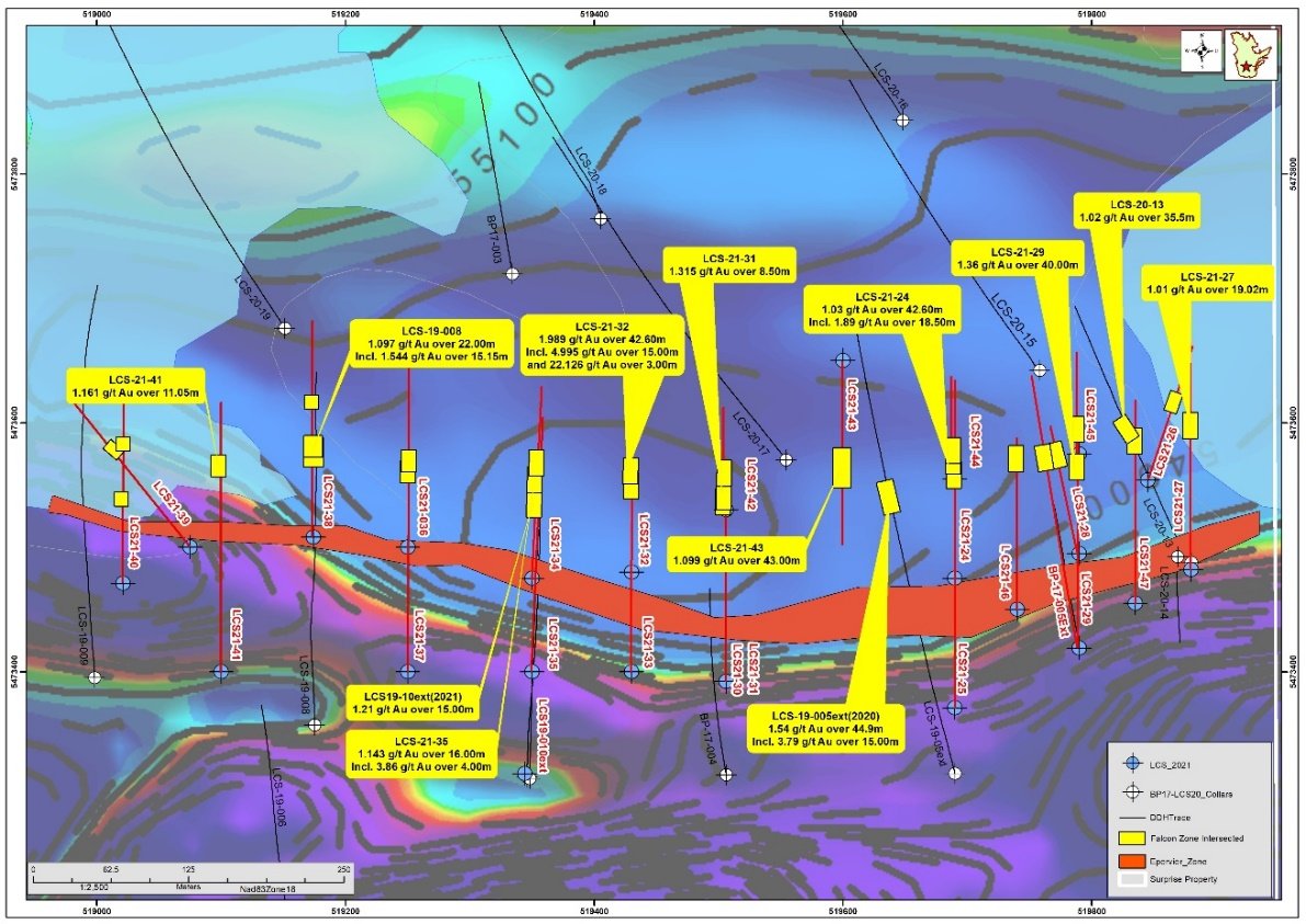 Figure 3. Highlighted drill intersections with gold values >1.0g/t Au, Falcon Gold Zone highlighting lateral continuity with remarkable consistency and predictability.