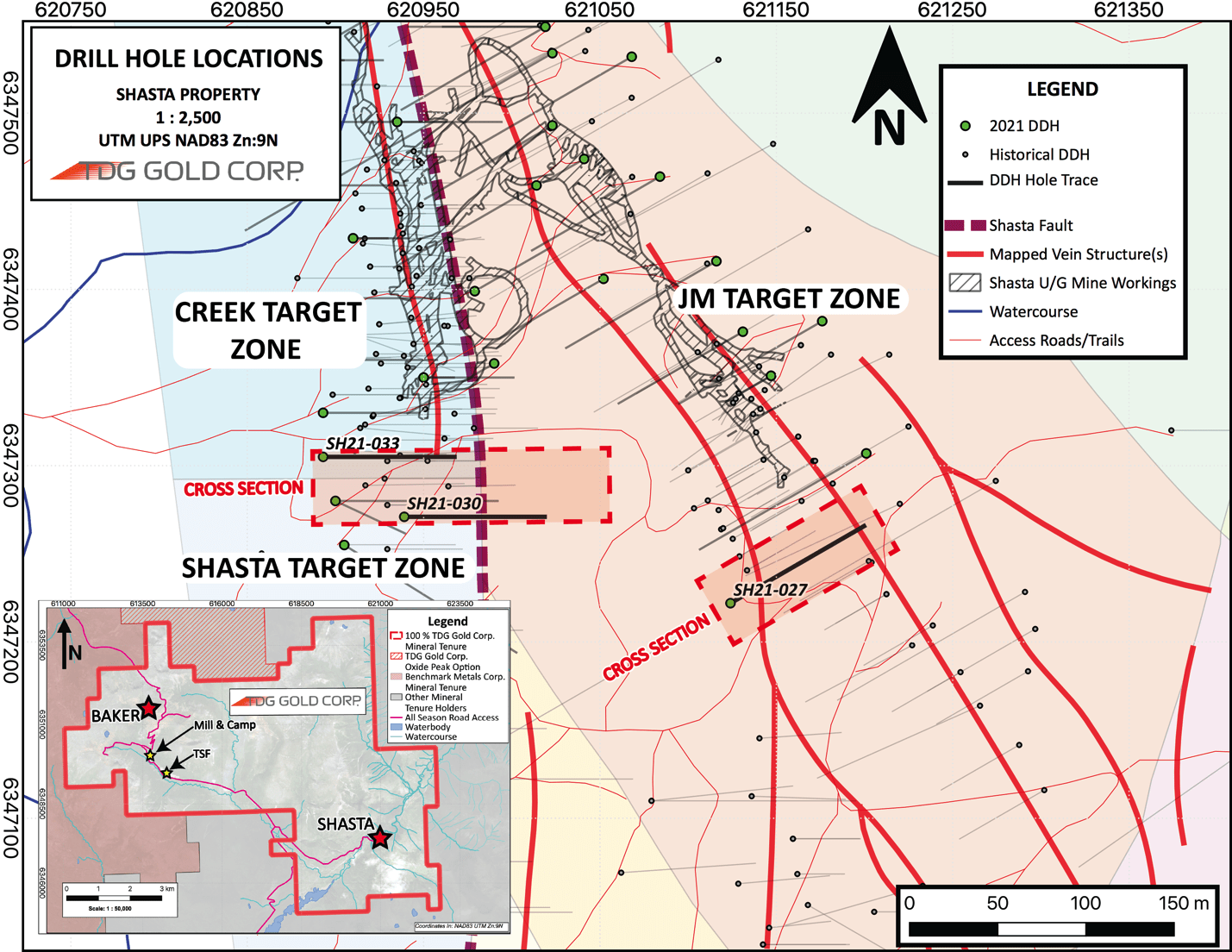 Steven Kramar, TDG’s Senior Geologist and B.C. Program Lead, commented: “These drillholes demonstrate that the two mineralized structures (the Shasta Fault and JM Structure) still return appreciable precious metal concentrations beyond the historical mine working(s) extent. Importantly, historical drillholes even further south of these three 2021 holes, assayed less than 20 percent of the entire length of the hole, and leave potential to expand the mineralized target zone as we better understand the orientation of the mineralized breccia body and structural conduit.”