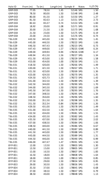 - TBL = 1.36% Li2O over 17.97 meters 429.50 meters down hole (TBL-035)