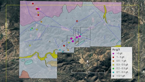 Geologic map of the Los Pavitos project showing strong northwesterly orientation of faults hosted largely by metasediments.
