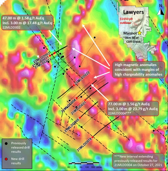 - Drill hole 22MLDD002 intersected 47.00 m of 1.03 g/t Au and 44.32 g/t Ag or 1.58 g/t AuEq including 3.00 m of 12.10 g/t Au and 430.08 g/t Ag or 17.48 g/t AuEq, providing an additional high-priority zone for follow-up ~300 m northwest of 21MLDD004. See Table 1 for additional results from the Marmot zone.