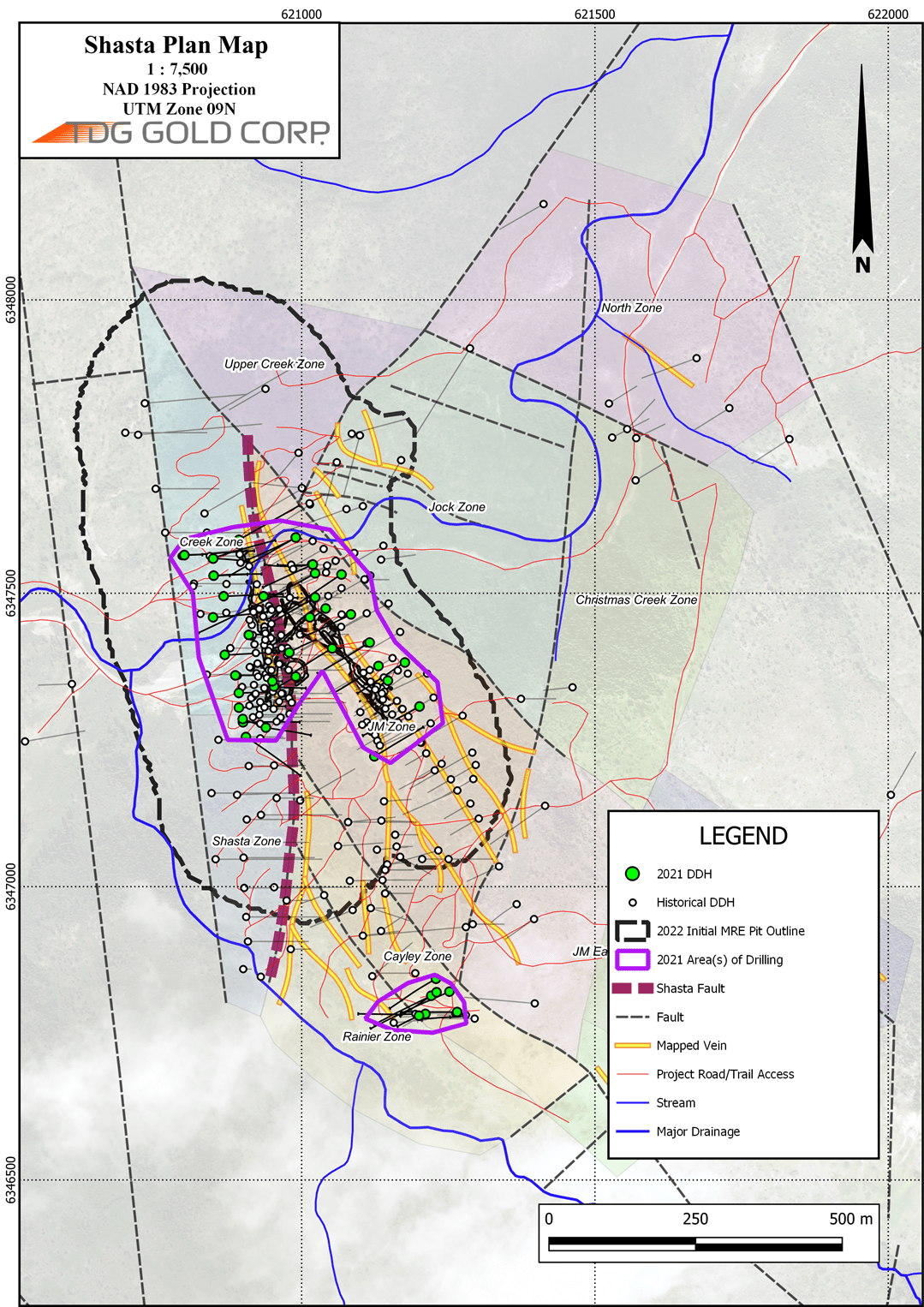 WHITE ROCK, BC / ACCESSWIRE / May 17, 2022 / TDG Gold Corp – (TSXV:TDG) (the “Company” or “TDG”) is pleased to announce an initial National Instrument 43-101 Mineral Resource Estimate (“MRE”) following the conclusion of its 2021 – Phase 1 drill program its former producing Shasta gold-silver (“Au-Ag”) mine. An updated technical report will be filed on the Company’s website and SEDAR within 45 calendar days of this disclosure.