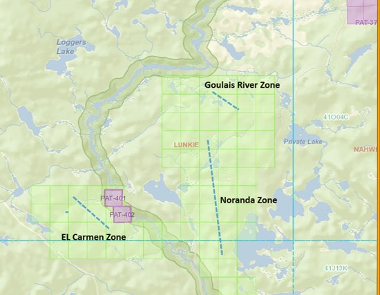 The three zones identified to date include 8 meters of massive sulphide mineralization in Noranda Drill hole (the Noranda Zone), pyrite, pyrrhotite and chalcopyrite in trenches (the Goulais River Zone) and pyrite and pyrrhotite with magnetite in trenches (the El Carmen Zone).