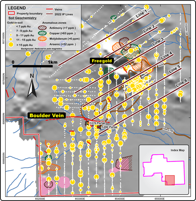 The IP crew is on site working on a southwest to northeast grid from 6 lines designed to test for deep conductors (Figure 3) In addition, the lines are designed to cover the known resource on the Boulder Vein, the southeast trending Chance Structural zone and the extents of the Freegold Intrusion. Results of the IP Program will be used for drill targeting and can be tested this year.
