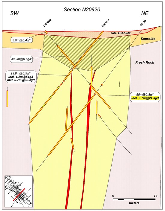 This section had only one historic hole (CC54) which was drilled oblique through the section. CC54 intersected 125m of continuous gold mineralization, comprising 22.2m @ 0.4 g/t gold in saprolite basement from 29.4m to 51.6m, and 102.7m @ 0.9 g/t gold in fresh basement rocks directly below, including 1.8m @ 5.7 g/t gold.