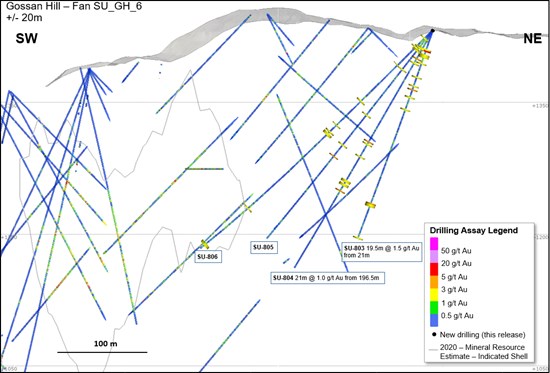 At Gossan Hill North, SU-768 returned 30m @ 28g/t Au from 181.5m, including 1m @ 717g/t Au from 205.5m, and 14m @ 26g/t Au from 358.5m, including 1m @ 360g/t Au from 371.5m.