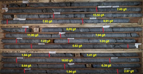 Figure 1: DD22-FLO-001 core photo of the majority of the 17.4 m of 6.52 g/t Au interval; grades listed on core.