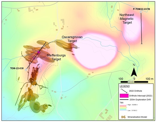 Hole TOM22-037B was drilled as an aggressive 665 m step out northeast from the historic Tomtebo Mine at a virgin regional target to test a magnetic high anomaly along the Tomtebo Mine Volcanogenic Massive Sulphide (VMS) mineralized horizon. No significant assay results were returned and interpretation from the whole rock geochemistry data is underway to provide vectors for possible follow up drill holes at this exploration target area.