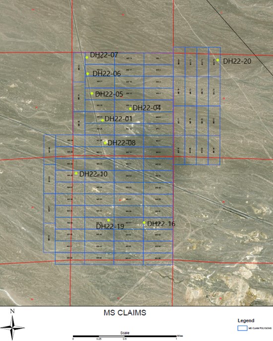 Drill hole DH22-04 was drilled to 190 feet and intersected a lower claystone horizon of 160 feet in thickness and 750 feet east of the higher-grade claystone in Hole DH22-01 suggesting the hole may have been drilled across a fault or on a different structural block of lithium bearing claystone.